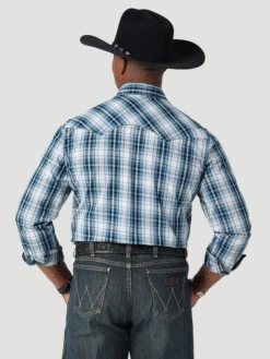 Wrangler 112317073 Mens Snap Plaid Long Sleeve Shirt Chambray Blue