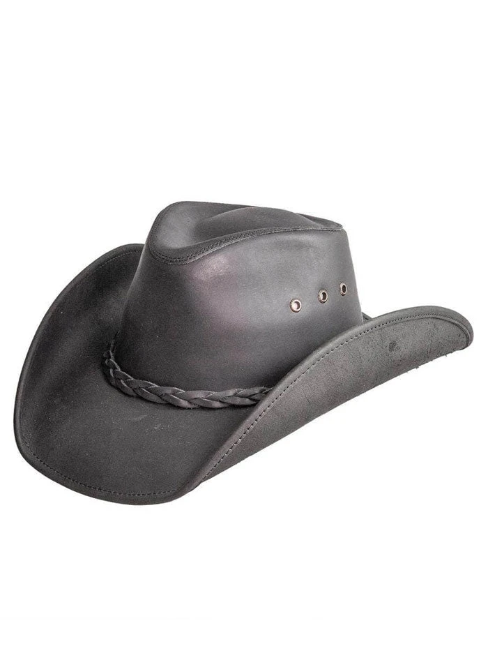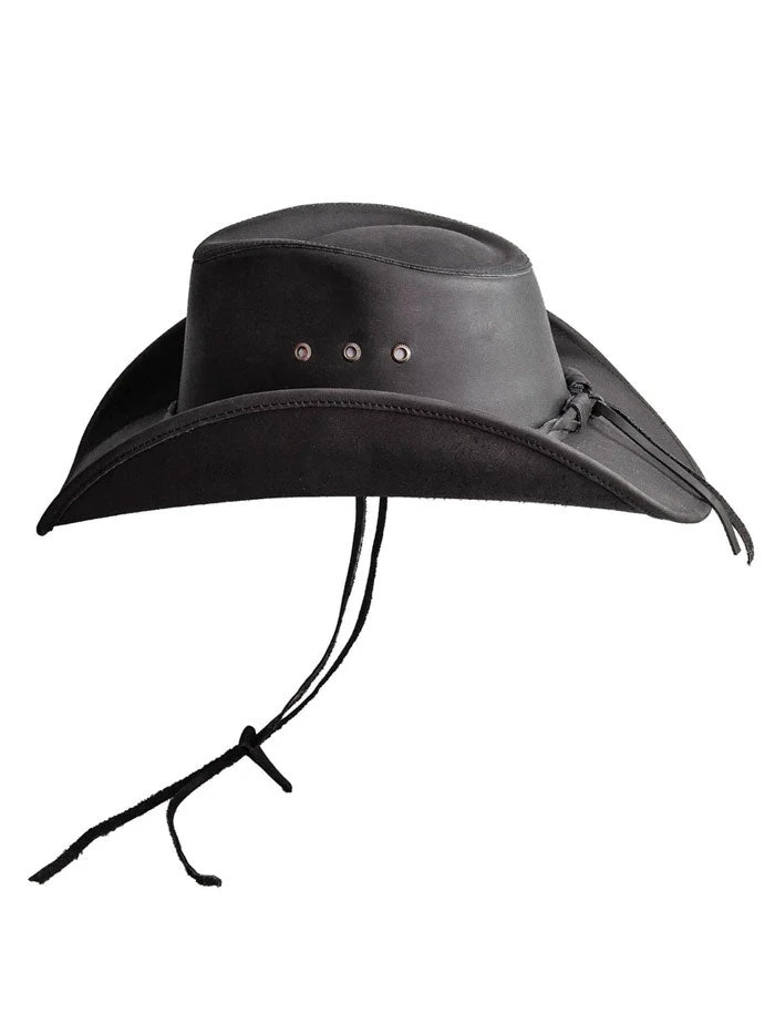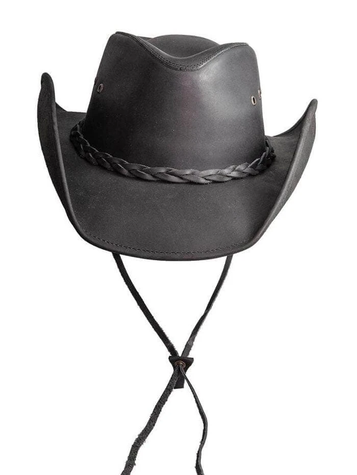 American Hat Makers HOLLYWOOD Leather Cowboy Hat Black –The Hollywood black mens leather cowboy hat has a front pinch, teardrop crown and a shapeable, wide brim for sun protection. Handmade in the USA from top grain cowhide, this unique, nontraditional western hat has a braided leather hat band knotted in the back with leather straps that dangle slightly over the back brim. Equal parts country, rock ‘n roll, bushman and biker, it has 3 ribbed bronze eyelets on either side of the crown for ventilation and an adjustable leather stampede string with fasteners that slides under the chin to keep it from blowing away in gusty winds.