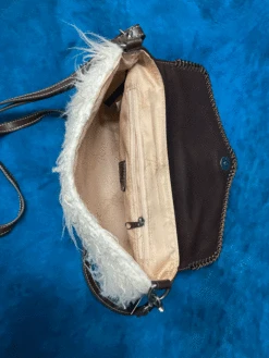 Angel Ranch D330001808 Ladies Angora Crossbody Bag Tooled Flap Tan – Fuzzy ivory angora material on bag with floral tooled flap. Snap closure to keep your belongings safe.