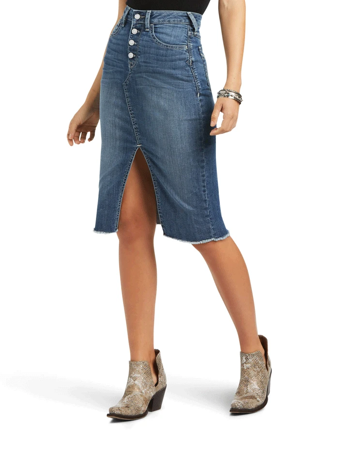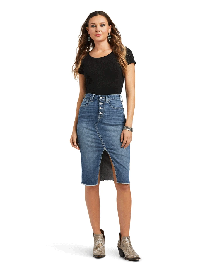 Ariat 10040577 Womens Denim Skirt Eleanor -This high-rise midi skirt comes with a vintage-y button fly and a front slit that shows just the right amount of leg. Add a crop top and wear it to everything this summer.