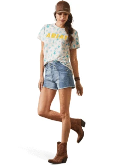 Ariat 10043204 Womens Jazmine Boyfriend Denim Short Blue Shades – Make a statement wherever you go in this two-tone jean short. The ultra high-rise fit and raw hem go with everything from tees to crop tops, boots to sneakers.