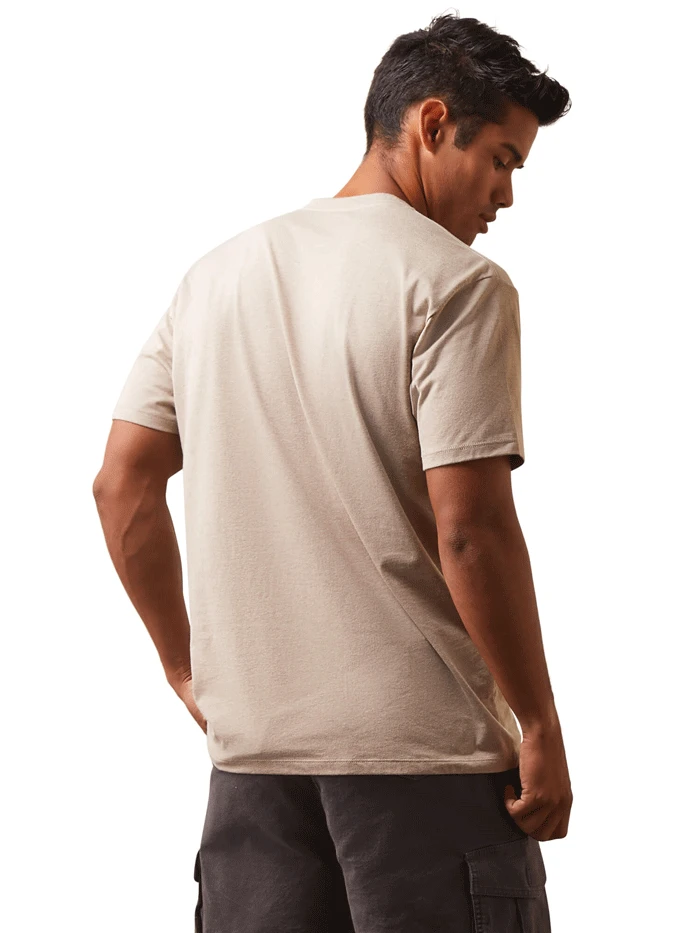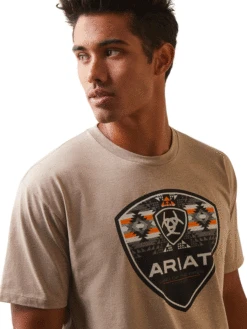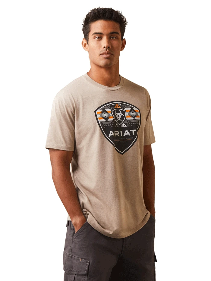 Ariat 10044769 Mens Geo Fill T-Shirt Oatmeal Heather -Perfectly fitted (not too tight, not too boxy), this comfy tee features a bold Southwestern logo across the chest. It’s the kind of four-seasons shirt that looks as good with shorts as it does under a flannel.