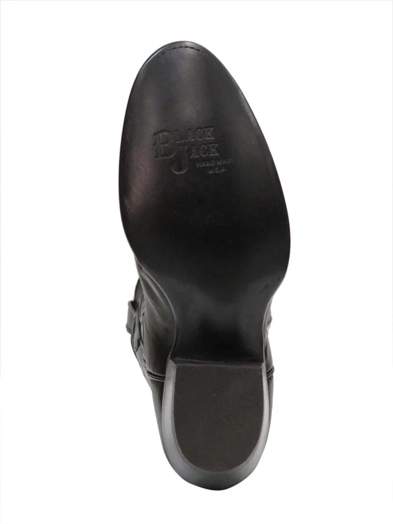 Only the best exotic and smooth leathers are used for Black Jack Boots vamps and heel foxing. Black Jack Boots uses Shenandoah calf and cream cow linings, and only leather side-seams and piping. The soles are made with a durable 10-iron outsole, 4-iron welt, and 9-iron insole. Black Jack Boots use a 5 inch/16 gauge double ribbed steel shank covered with the best side-bend leather available and they secure it with sixty lemon wood pegs for a lifetime of support. The heel counters are also made of the best side-bend leather and Black Jack Boots only use solid leather stacked heels.