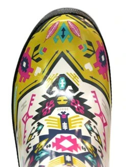 Stay comfortable, warm and dry with these Blazin Roxx ladies round toe rain boots by M&F Western Products. These are a white boot with bright multi colored southwestern designs all over the boot. With an adjustable buckle and gusset you can get a perfect fit. These are also barn acid approved with proper care and storage.