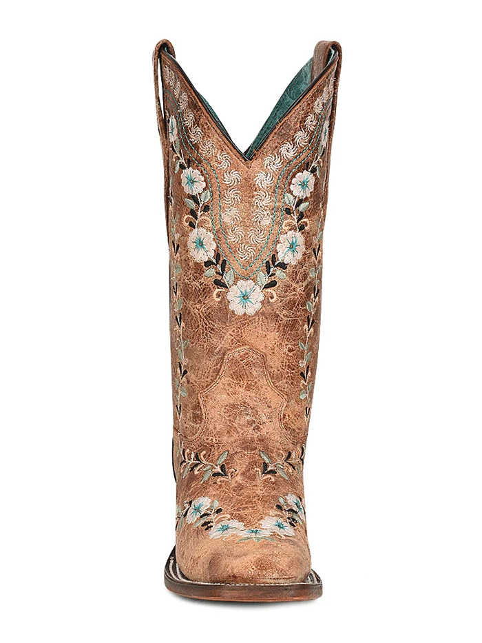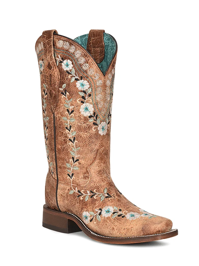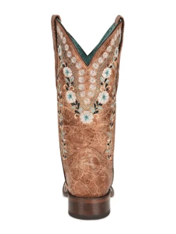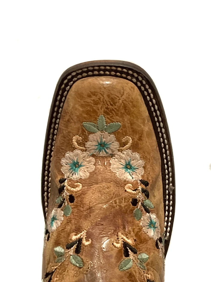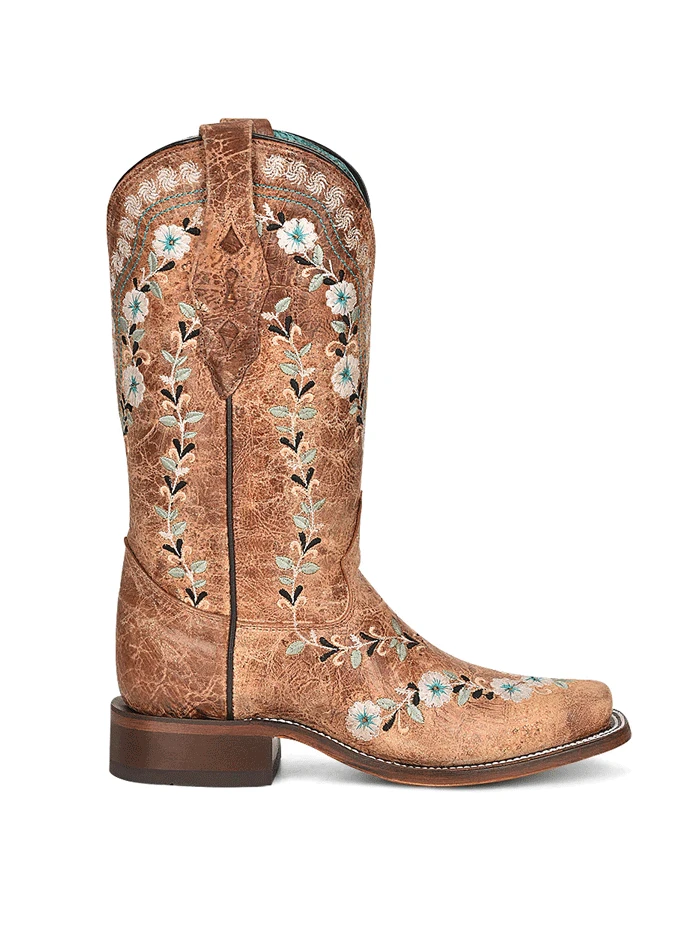 Corral A4398 Ladies Floral Embroidery Square Toe Western Boot Distressed Cognac