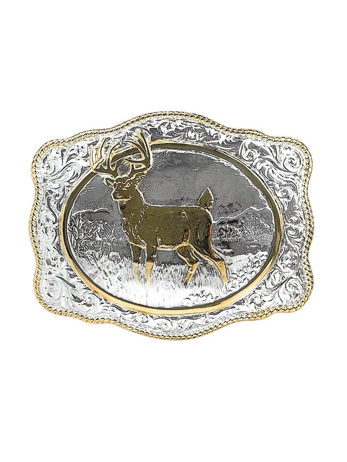 Crumrine 38062 Vintage Buck Buckle Silver – Rope edging with whitetail deer in the center. This Crumrine buckle has a vintage look with a gold plated deer. This buckle will look great with your favorite pair of jeans or dress pants.