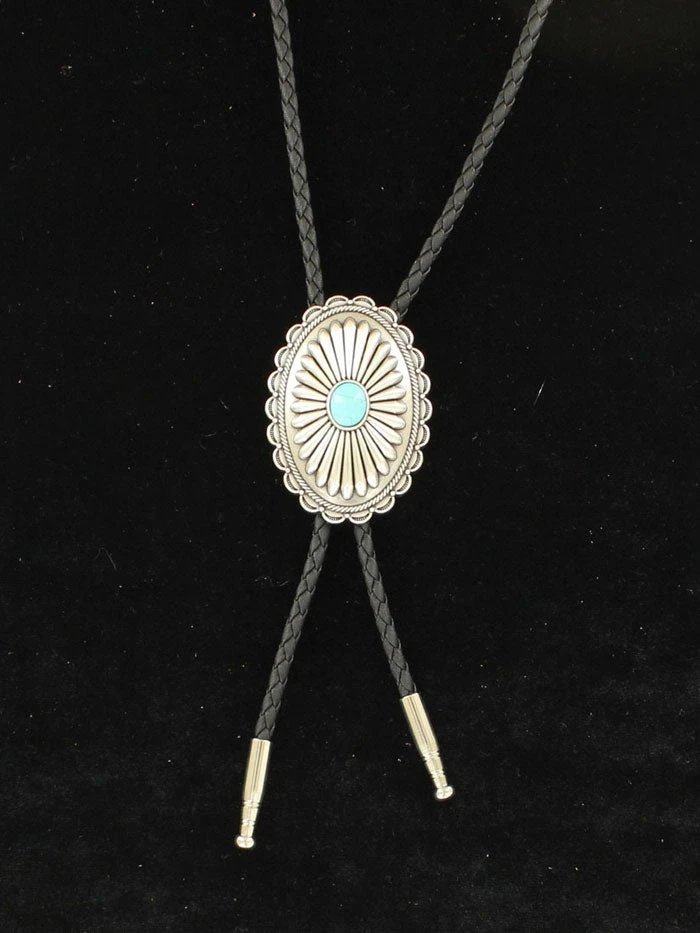 Stylish Double S bolo tie by M&F Western Products. Black bolo tie with a silver colored oval flower concho that features a turquoise center stone. This bolo tie will certainly get you noticed.