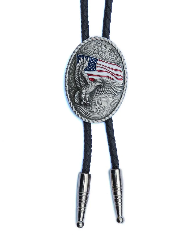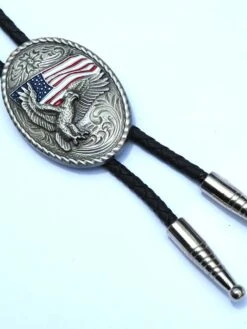 Add some flair to your western wear! Double S bolo tie by M&F Western Products® features a black braided rope with silver tips accented with a silver western engraved oval concho embellished with an eagle over a painted USA flag. Adult bolo-36″ long.