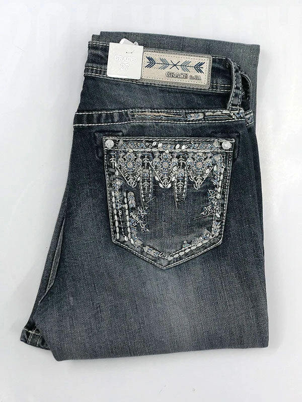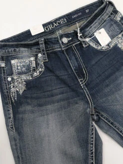 Grace in L.A. draws its inspiration from the crystalline vistas of the City of Angels and the eclectic, effortless style of its chic inhabitants. Romantic with an edge feminine and strong, Grace in LA features specialized pocket treatments with intricate embroidered bejeweled, and metallic motifs. Each pair is carefully crafted for a flawless fusion of silhouette and detailing. Grace in LA uses only the finest fabrics, washes and finishing techniques.