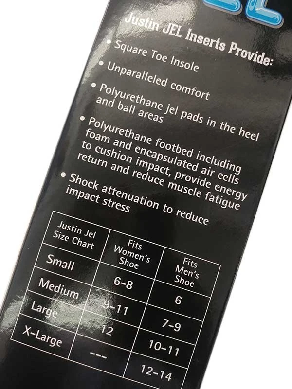 This Justin Jel Square Toe Insole provides unparalleled comfort. The polyurethane gel pads in the heel and ball areas also include foam and encapsulated air cells to cushion impact, proved energy return and reduce muscle fatigue. Shock attenuation reduces impact stress. Feel the comfort!