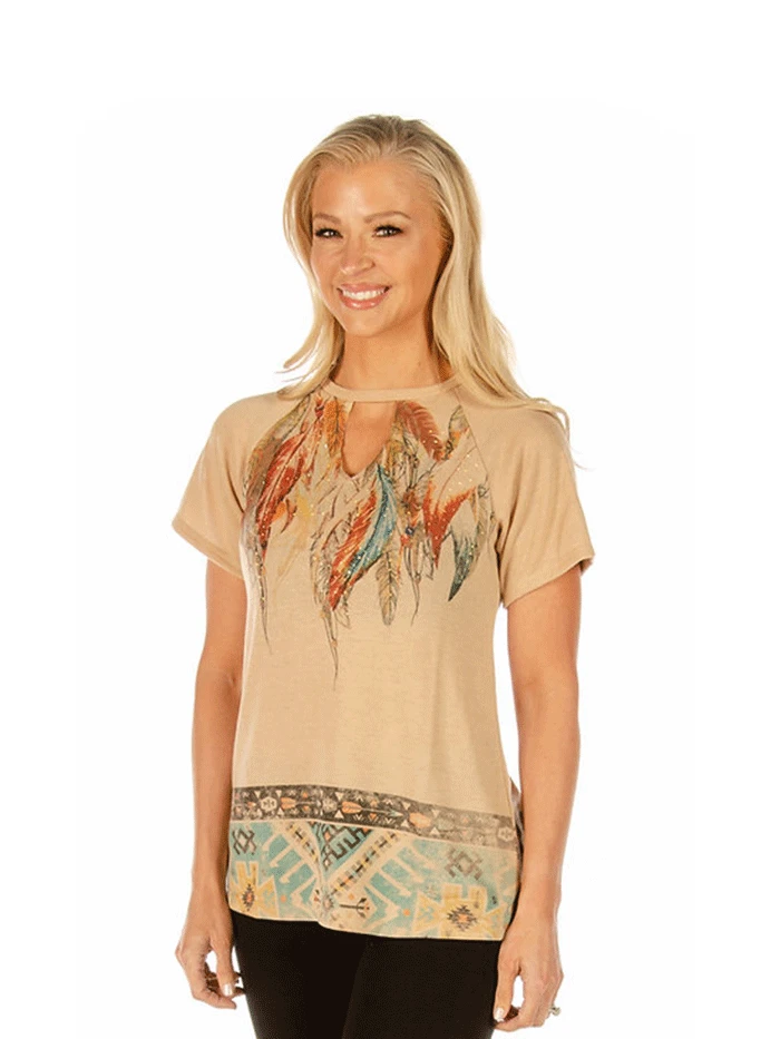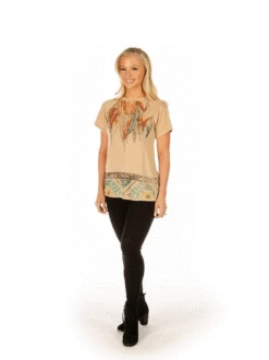 Liberty Wear 7233 Womens Adorn in Feathers Neckline Top Tan