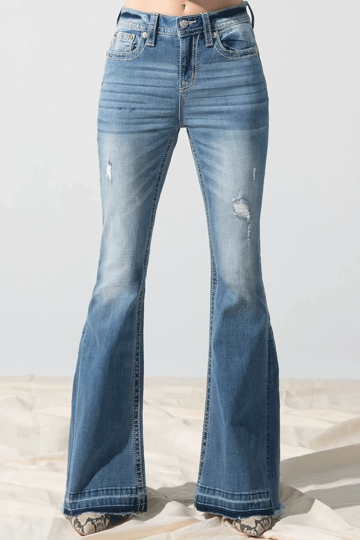 Miss Me H3636F56 Womens Not So Fray High Rise Flare Jeans Light Blue – High rise Flare detailed with contrast stitching, destruction, frayed hem with detailing and a 5 pocket design with rhinestone rivets.