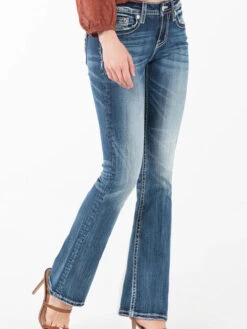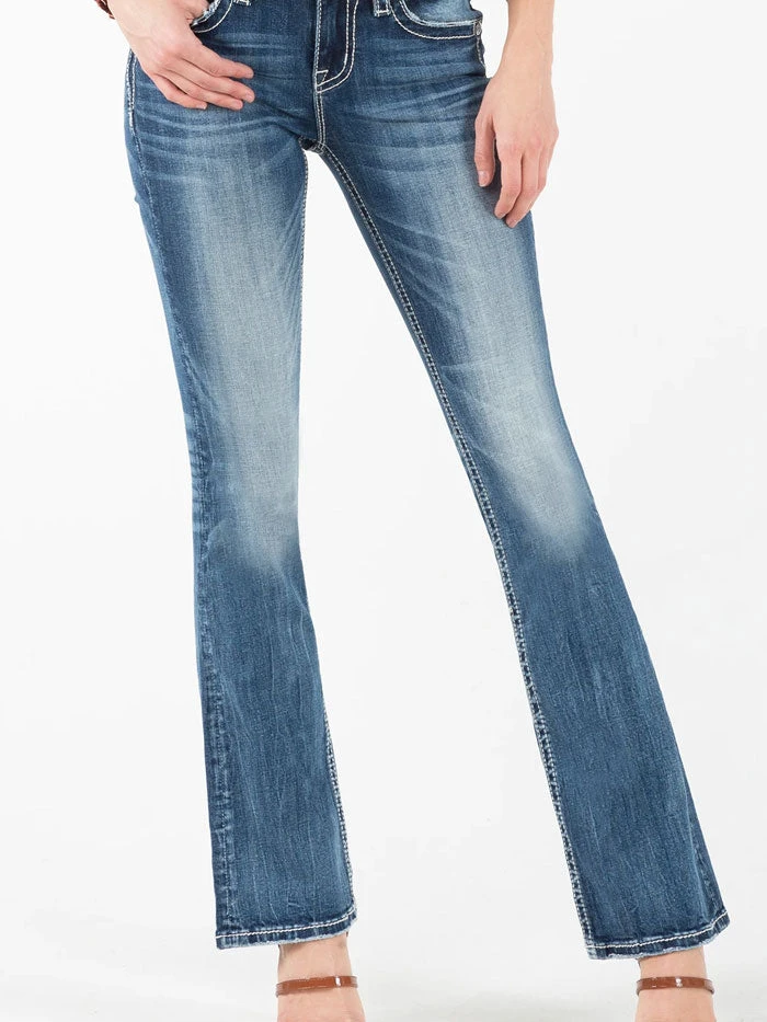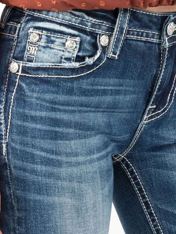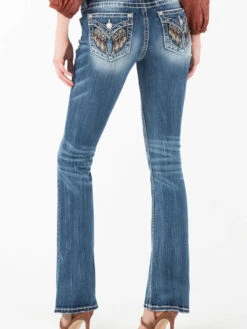 Miss Me M5082B111 Womens Sparkle Life Bootcut Jeans Medium Blue –Â Show off your shiny style in this pair of must have bootcut jeans featuring an embroidered wing design, contrast stitching, and a faux flap pocket with rhinestone rivets.