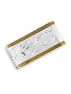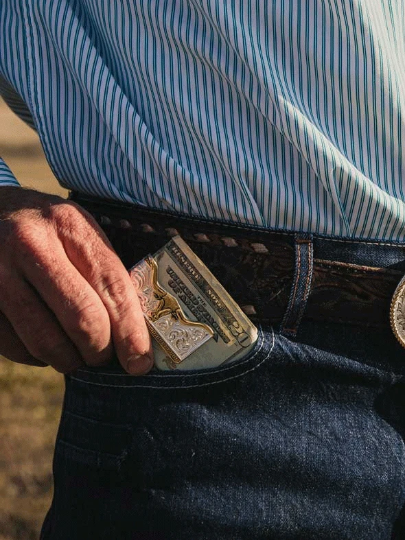 Montana Silversmiths MCL5235 Two-Tone Carved Longhorn Money Clip Silver – Set against a shining silver background a fierce carved longhorn stands out in a bright gold tone to create a distinctive look on the Two-Tone Carved Longhorn Money Clip. Practical and comfortable this slim money clip is an easy and secure way to hold your cash. Its beautiful design is accented with classic western filigree to create a piece that is sure to show off your personality and singular style.
