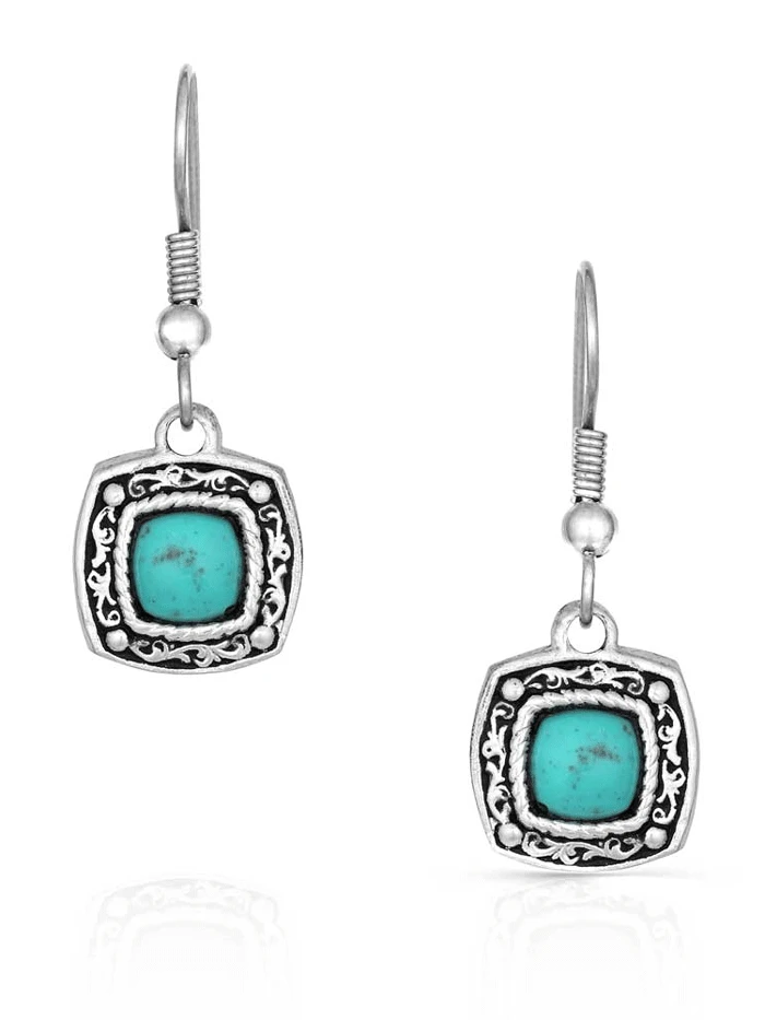 Montana Silversmith ER1263 Womens Blue Earth Turquoise Drop Earrings Silver – Small square pillow cut turquoise stones are set in antiqued silver and filigree frames dropping just a little down from French hooks for a little dangle, a little flash and flair.