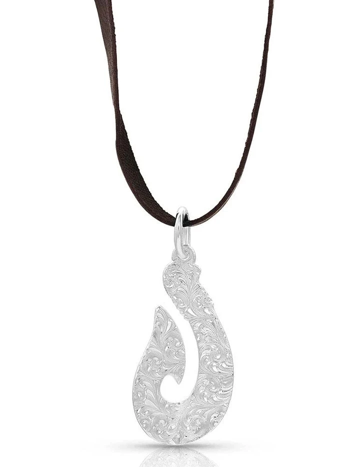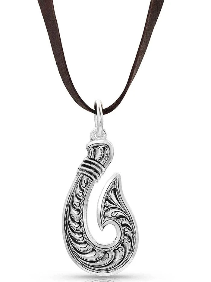A little twist on a Montana Silversmiths silver men’s necklace with a leather cord instead of a chain. A thick antiqued silver stylized hook, reminiscent of a fishing hook, hand-engraved lines that sweep through the center of the hook design stretching through the edges. A smooth wire edge finishes off the design. A genuine leather 30 inch adjustable cord allows to be at your perfect length.