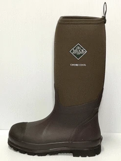 Muck CHCT-900 Mens Chore Tall XpressCool Brown -You can guarantee that our best-selling Chore collection provides the comfort and protection that a work boot needs, to handle the toughest of jobs. The Chore Cool is a reliable work boot with its rugged and dependable design; perfect for farmers or simply for trudging across muddy fields. These work boots feature a rubber overlay and quick cleaning sole, allowing you more time to get on with the important stuff. The upper is reinforced in both the toe and heel area, plus additional arch support giving you the protection you need. The 4mm neoprene makes these boots lightweight and flexible, with XpressCoolâ„¢ technology – a moisture wicking lining to keep you cool on warmer days. Differentiating itself from the Chore Classic Tall XpressCool, these quick cleaning rubber outsoles offer even more durability and traction on slick surfaces.