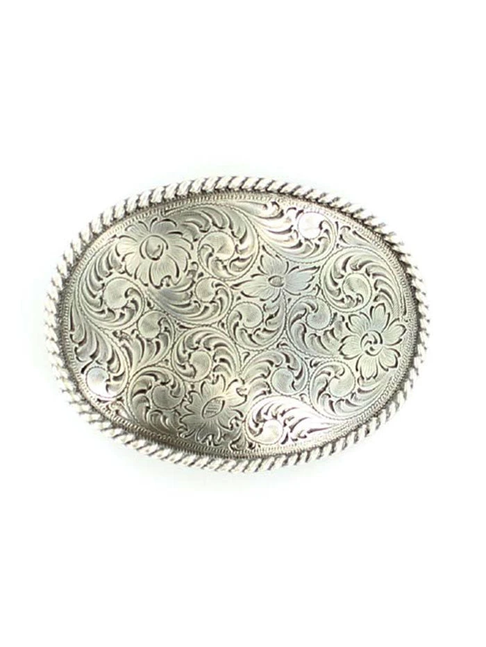 Nocona 37222 Oval Scrolled Buckle Silver – features a silver floral engraved oval shaped buckle with a rope edge.