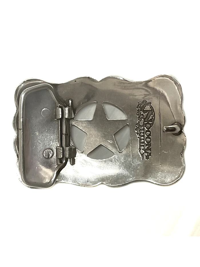 Nocona 37232 Gold Star Buckle Silver – Silver scalloped edge Nocona buckle with scroll floral design. Gold star cut out in center which offers the latest in cowboy fashion.