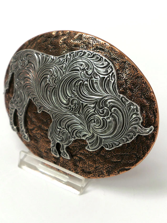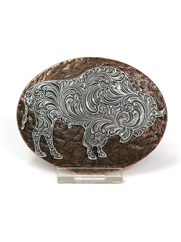 Nocona 37712 Oval Hammered Edge Buffalo Belt Buckle Copper And Silver – Copper hammered background with a large western scrolled silver buffalo motif.