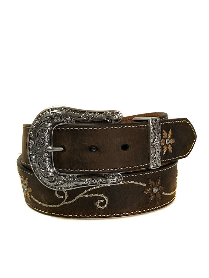 Nocona N3447044 Ladies Embroidered Belt Brown – This ladies Nocona belt is definitely fashion forward. Each embroidered flower is accented with a delicate rhinestone center giving this belt the perfect blend of county simplicity and stylish bling. The removable buckle makes it customizable for your favorite buckle. Perfect belt for any pair of jeans.