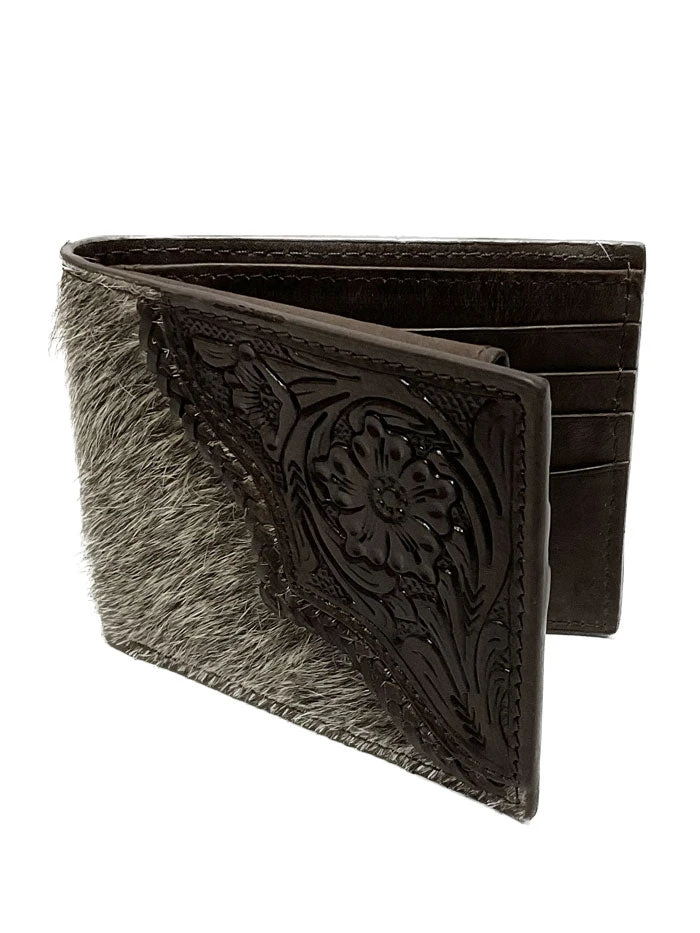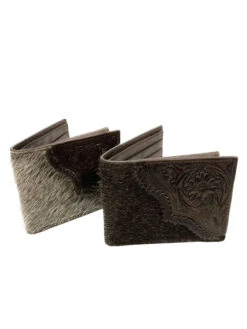 Nocona N500033002 Mens Calf Hair Tooled Edge Bifold Wallet Brown – This Nocona leather bifold wallet has calf hair on the front with a floral tooled upper right corner. Beautifully accented with a braided leather edge.