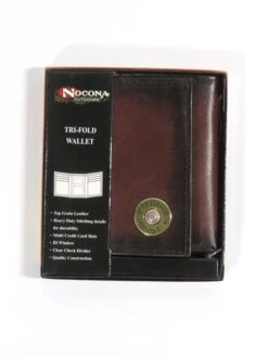 Nocona N5429902 Mens 12 Gauge Outdoor TriFold Leather Wallet Brown – features a great classic western style. It is designed with a 12 gauge shotgun shell concho on the front. Inside features a clear ID holder, 6 credit card slots, removable photo insert, and a place for your cash. Buy for yourself or give this quality western gift to that special someone.