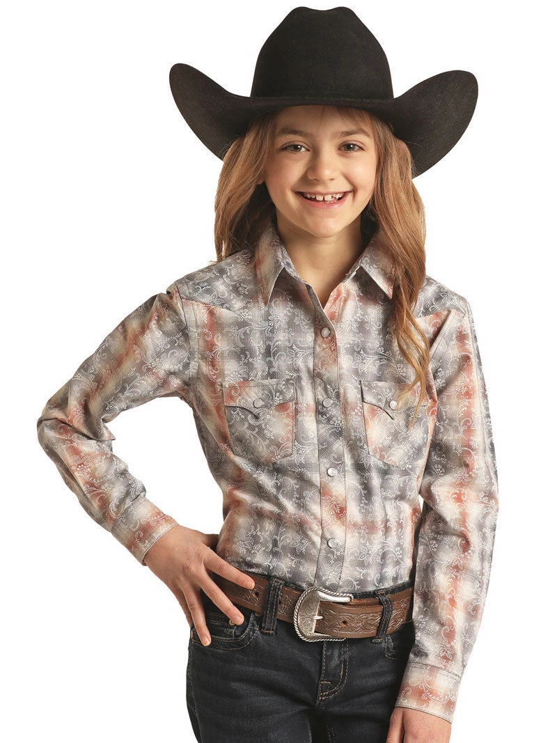 Panhandle R6S2520 Kids Plaid with Paisley Overprint Snap Shirt Grey