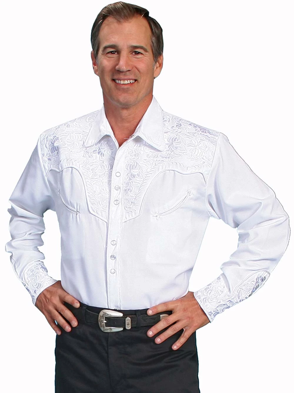 Scully P-634WHT Mens Floral Tooled Embroidery Western Shirt White