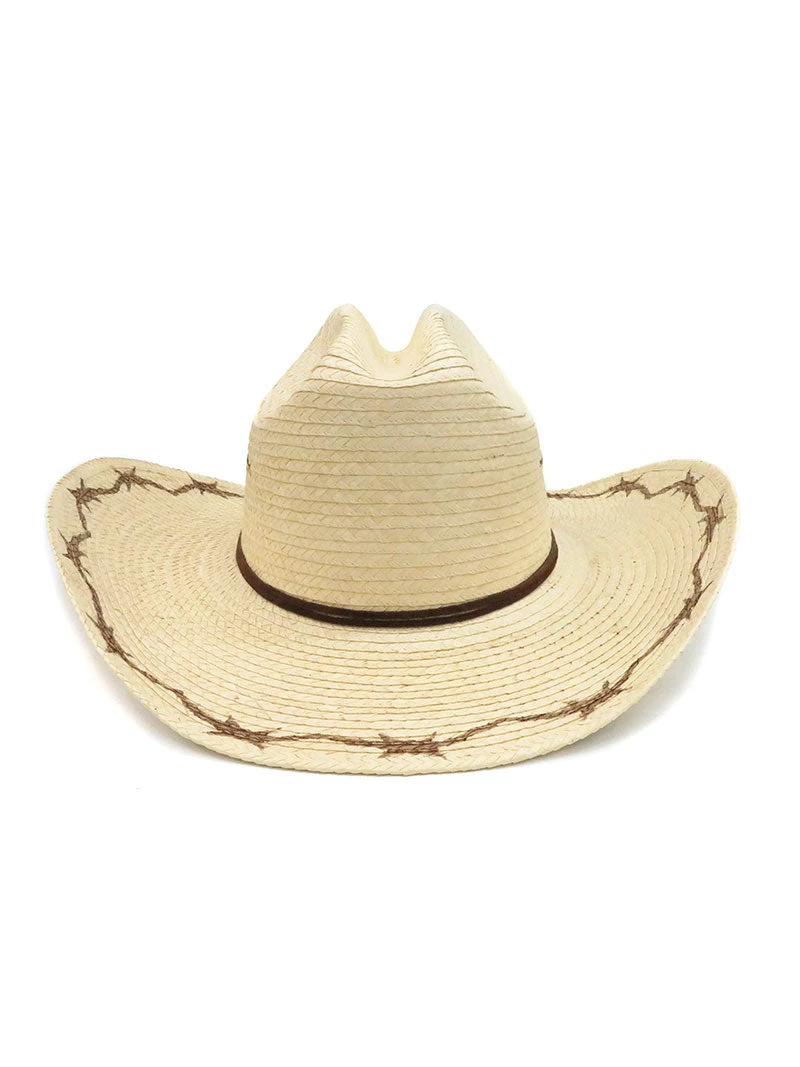 SunBody HGKC-BW2 Kids Cattleman Barbed Wire Straw Hat Natural – 3-1/2″ Brim, Heat Pressed. Elastic sweatband. Fits sizes 6-7/8 and smaller. Guatemalan economy palm. Barbed wire design on brim & crown as shown. Not distressed.