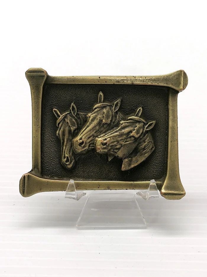 Three Horseheads USA Made Brass Finish Belt Buckle 5104