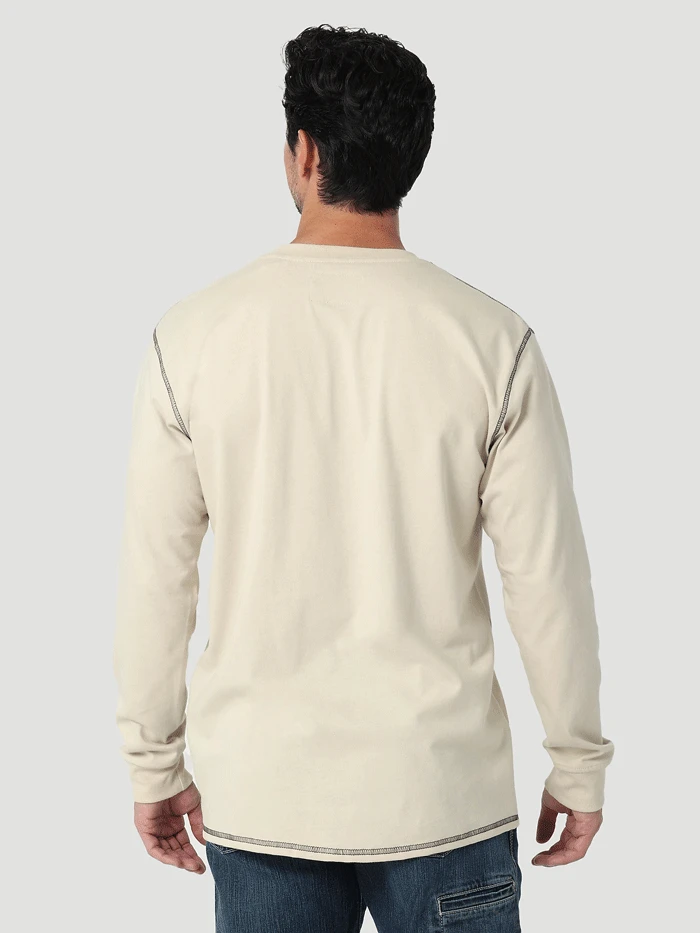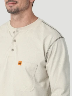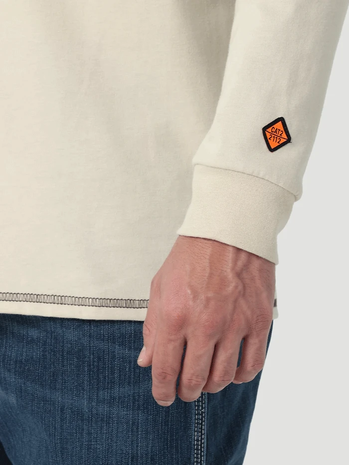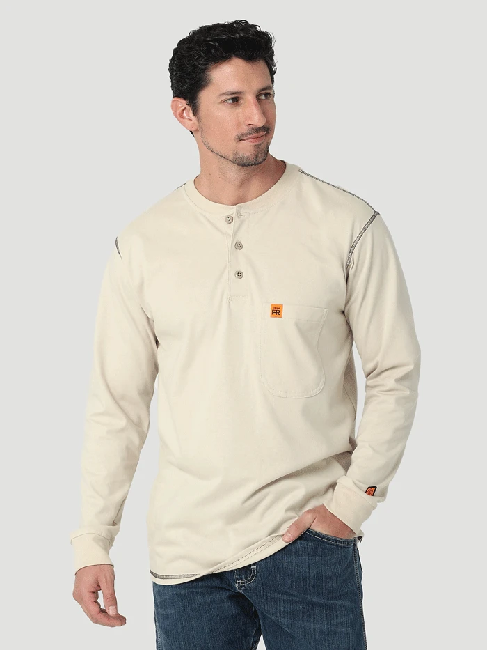Wrangler 10FR161SD Mens Flame Resistant Long Sleeve Henley Tee Sand – Where comfort and safety are required, the Wrangler® RIGGS WORKWEAR® flame-resistant (FR) long-sleeve henley has you covered. It’s crafted from cotton for breathability when you need it most. This casual work shirt comes with a left patch pocket and two orange safety labels for increased visibility. It features a relaxed fit for extra freedom of movement and fire-resistant threads at all seams. Wear it with your favorite pair of Wrangler FR jeans or carpenter pants to finish the look and be ready for anything that comes your way.