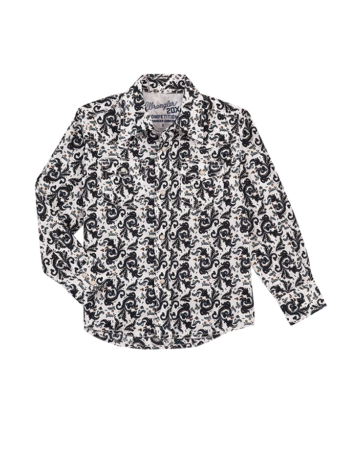 Wrangler 112317147 Kids 20X Competition Advanced Comfort Shirt Blue – Your little man will always look cool in this rough and ready long sleeve print shirt. The Western yokes provide a touch of authentic style, while the snap front and cuffs finish off the look. Incredibly comfortable, he’ll look sharp but never miss a minute of the fun.