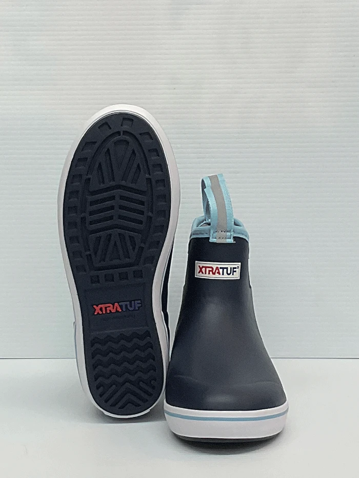 Xtratuf XWAB-201 Womens Ankle Deck Boot Navy -The Ankle Deck Boot collection has been crafted specifically for Off-Shore anglers. Anglers are athletes, and like any athlete they need the best footwear to help them perform at a high level. We’ve created a lightweight design with the same slip-resistant Chevron outsole found in our Legacy boots. The performance ankle deck boot is the perfect boot for any on the water athlete looking for protection with slip-on-and-go styling. This Navy boot features a complementary light blue detail at the sole, pull-tabs and top lining for added style.