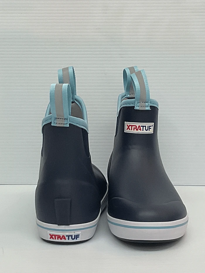 Xtratuf XWAB-201 Womens Ankle Deck Boot Navy -The Ankle Deck Boot collection has been crafted specifically for Off-Shore anglers. Anglers are athletes, and like any athlete they need the best footwear to help them perform at a high level. We’ve created a lightweight design with the same slip-resistant Chevron outsole found in our Legacy boots. The performance ankle deck boot is the perfect boot for any on the water athlete looking for protection with slip-on-and-go styling. This Navy boot features a complementary light blue detail at the sole, pull-tabs and top lining for added style.