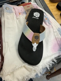 Yellow Box 52565 Womens Foliage Flip Flop Sandals White Multi- A warm weather staple you can’t resist! The Foliage flip-flop sandals feature a glittery ombre upper with a knit fabric overlay, and our classic Yellow Box EVA foam sole is designed to offer comfort in every step.